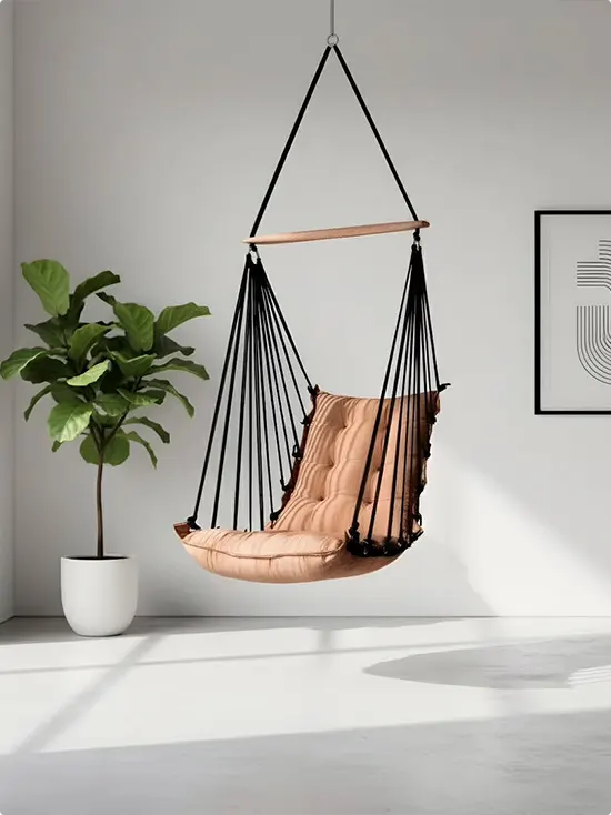 This one is clean and calm — a tufted caramel cushion sits in a simple hanging chair against a white wall.