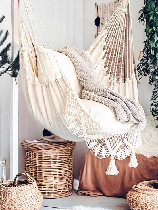 Cream fabric, macramé fringe, and a chunky gray knit throw — this hammock chair looks like it was made for lazy Sunday mornings.