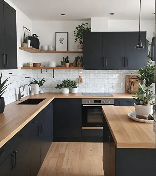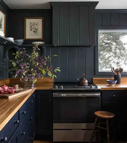 Matte black cabinets with wood countertops? That’s a combo that feels modern and warm at the same time.
