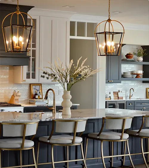 The island is navy with these stunning brass lantern pendants hanging above. They’re like jewelry for your kitchen.