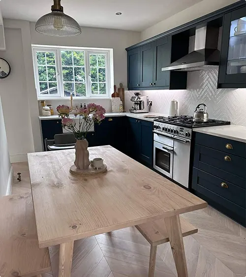 Navy Cabinets With Raw Wood Table