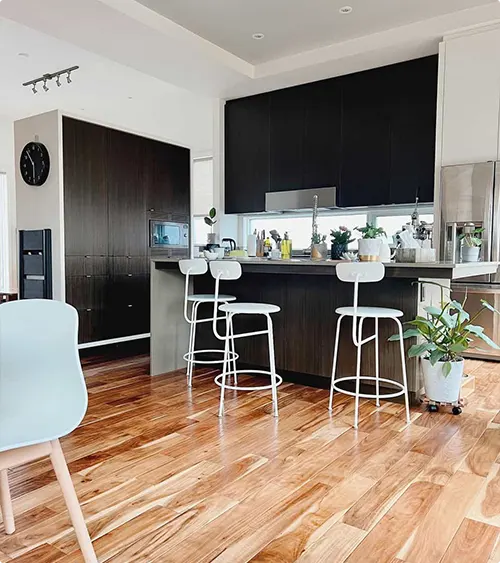 White bar stools keep the seating area light. Wood floors tie into the darker wood cabinet.