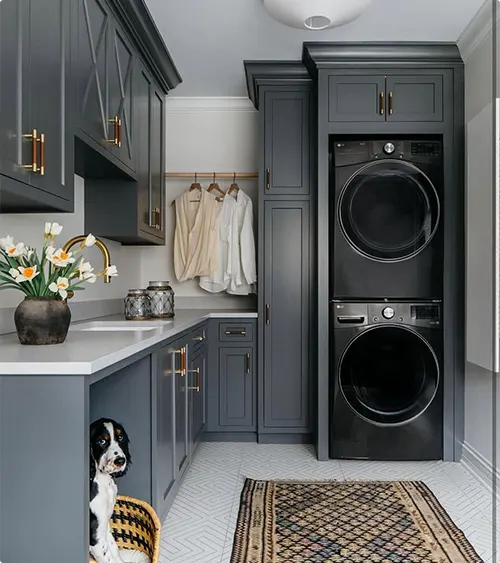 Stacking the washer and dryer vertically is a game changer for tight spaces. It frees up room for that little built-in dog nook, which is honestly the cutest detail.
