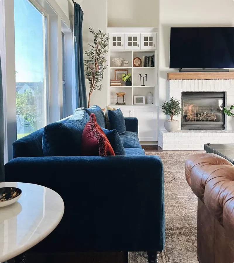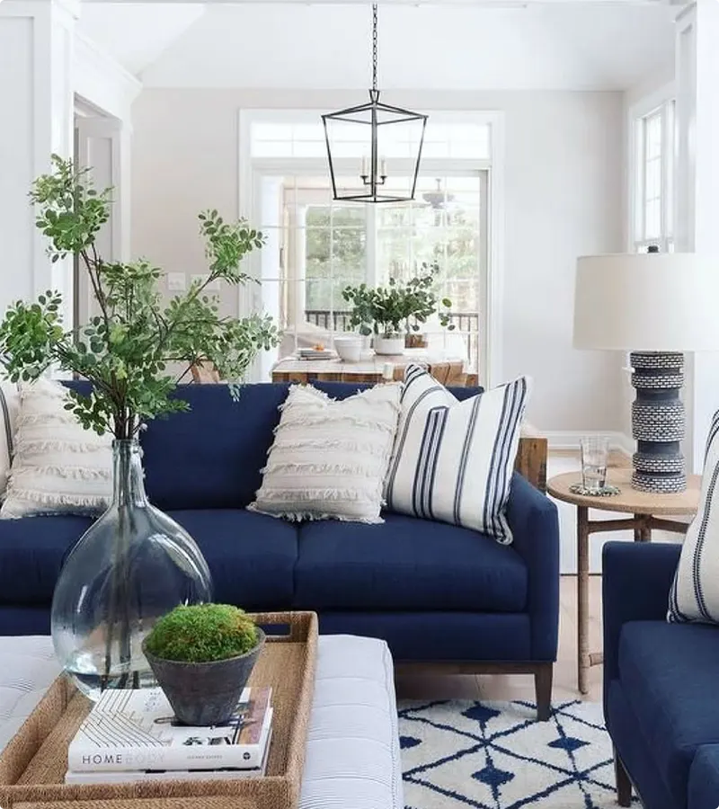 A navy blue couch is highly versatile. It looks stunning in coastal-inspired spaces with white and natural textures, adds elegance to modern or glam interiors with metallic accents, and feels cozy in farmhouse or rustic living rooms with wood and neutral tones.