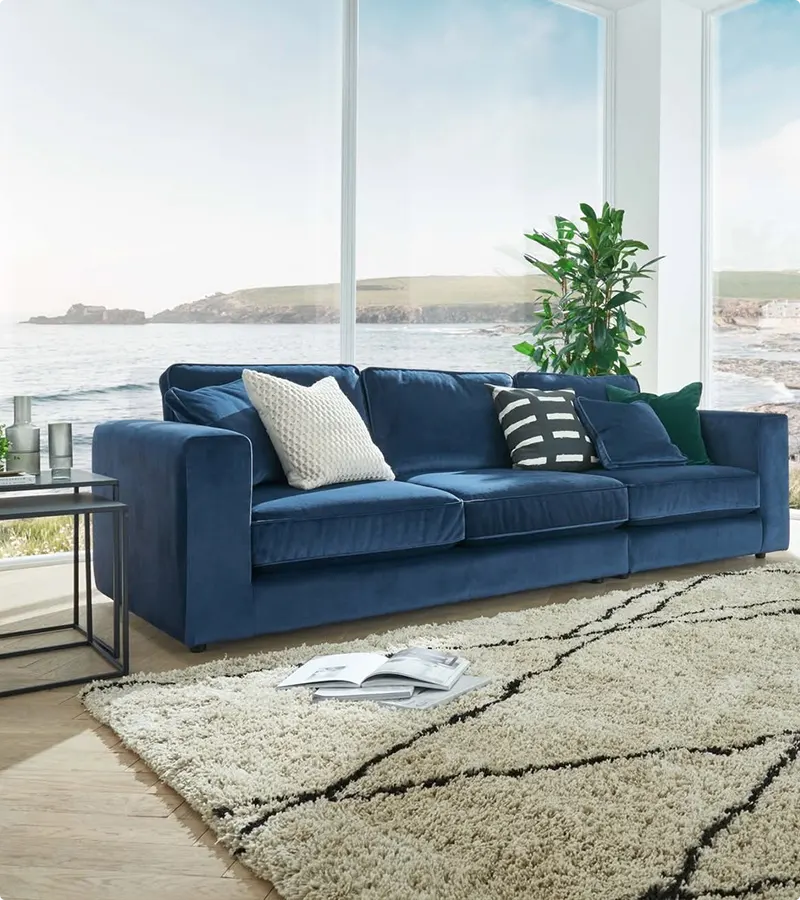 Navy Blue Couch with Ocean View and Cozy White Rug