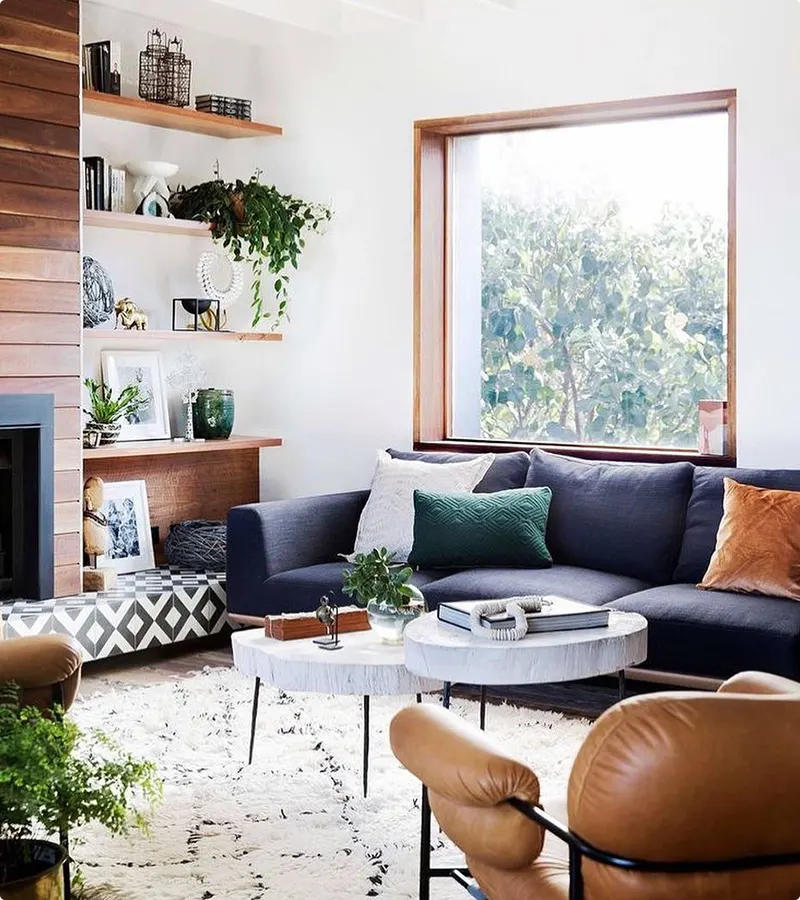 This image is a masterclass in making a bold color feel absolutely neutral and cozy. The navy couch here has a slightly textured, almost indigo fabric that pairs beautifully with the whole earth-toned color palette, think terracotta, oatmeal, and sage.