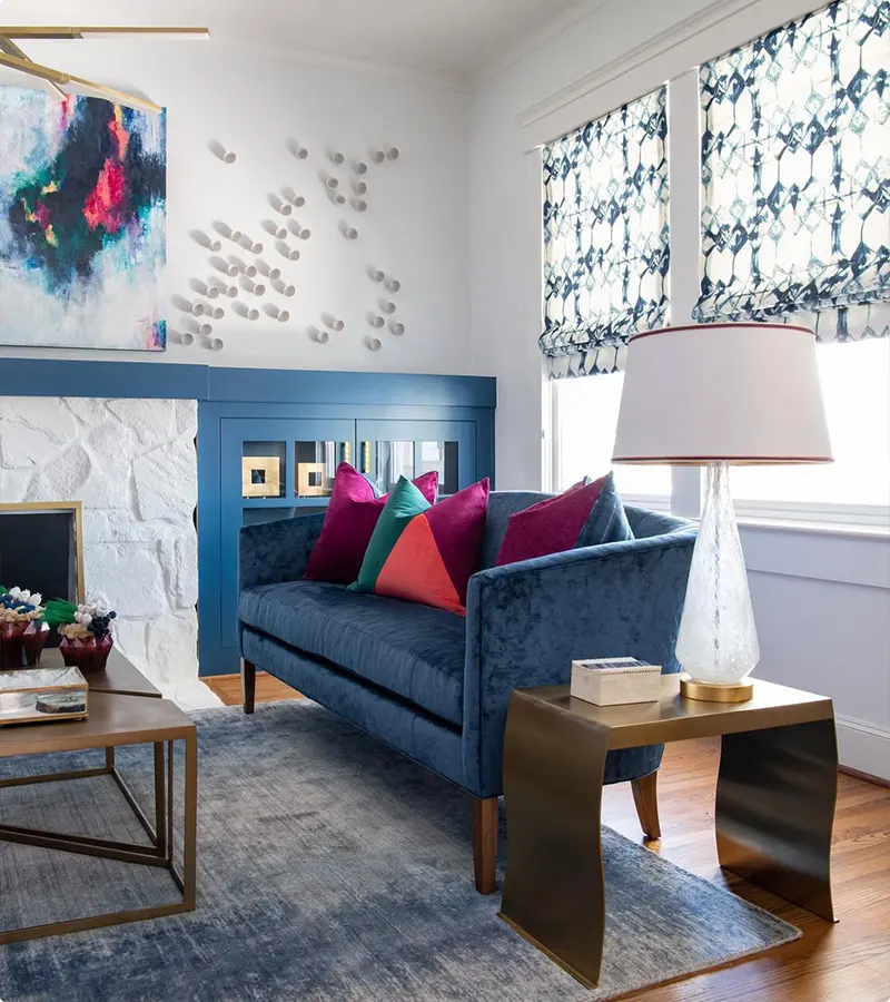 Did you notice the fireplace surround is painted the same deep blue? It works because the cool navy acts like a stable backdrop for all those warm, energetic jewel tones, making the room feel rich and sophisticated, not chaotic. And those patterned Roman blinds? Love that touch of movement!