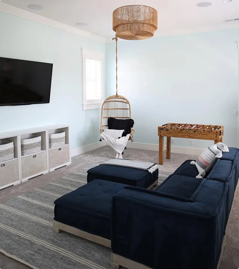 This room just breathes relaxation. That big, comfy navy sectional is practically begging you to stretch out, right? And paired with those super light, almost sky-blue walls, it creates this incredibly serene, coastal-inspired feel without being overly themed.