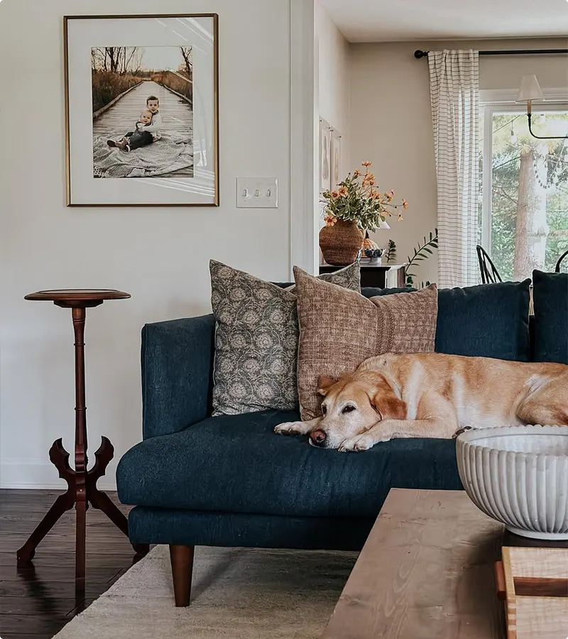 I mean, it works because the deep couch grounds the bold colors, letting the accents shine without overwhelming the room. Try throwing in some bright pillows like these to liven up your space, maybe even let your pup pick one, you know what I mean?