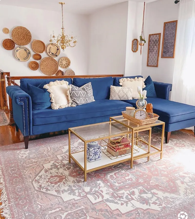 The blue rug ties it all together, and that chandelier adds a little elegance without trying too hard. This works because the natural elements soften the bold couch, try adding a tray with books and plants like this to make your space feel inviting and stylish!