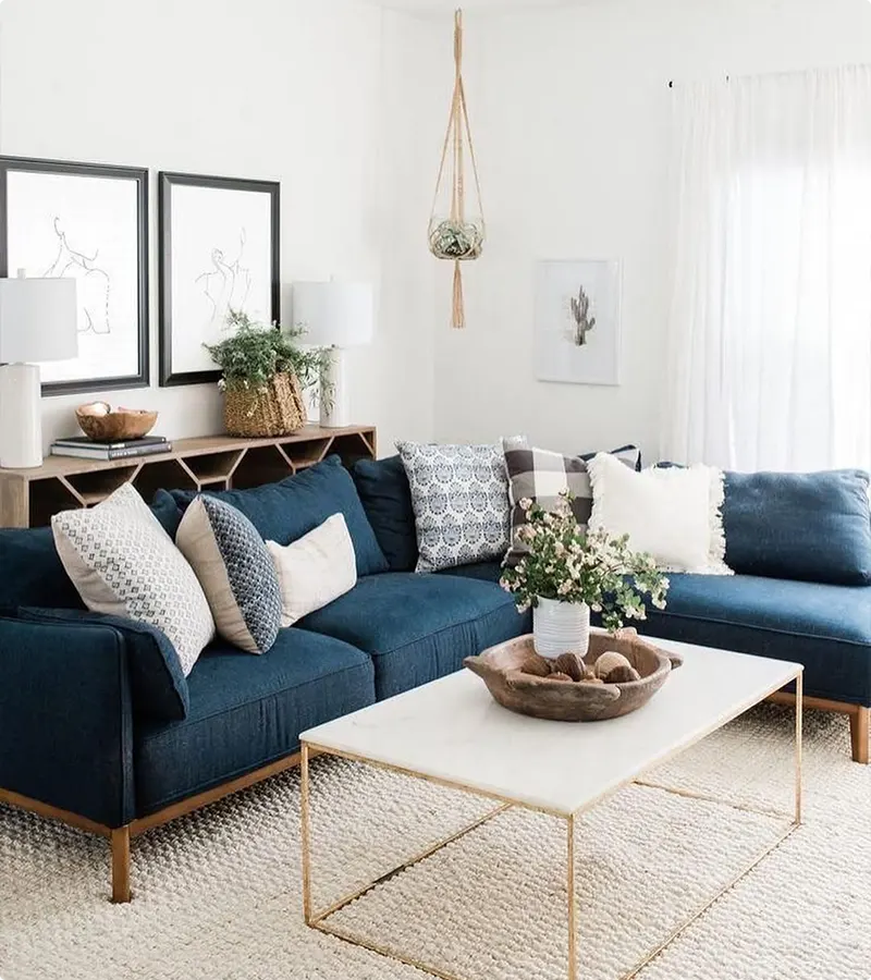 This is how you do modern and airy. The key here is the use of texture and material. That clean, rectangular white marble coffee table with the slim gold frame immediately elevates the deep blue fabric (which looks almost like a durable denim).