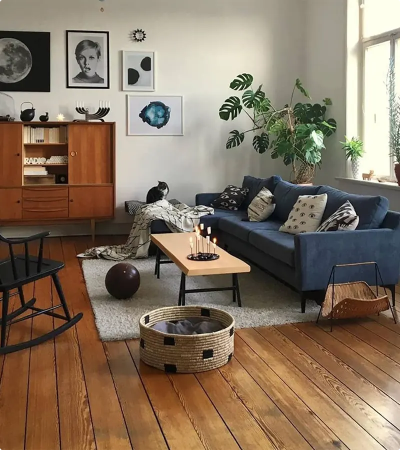 I’m not gonna lie, the hero of this room isn’t just the couch; it’s that amazing teak wood credenza. Pairing a slightly muted, almost suede-finish navy sofa with those warm, orange-toned Mid-Century woods? Chef’s kiss!