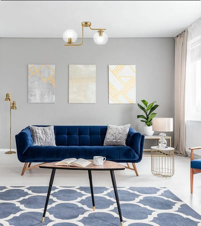 Navy Blue Tufted Couch with Modern Art and Blue Rug Harmony