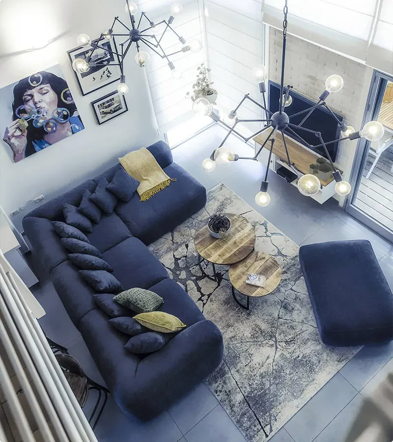 Navy Blue Sectional with Bold Art and Industrial Lights