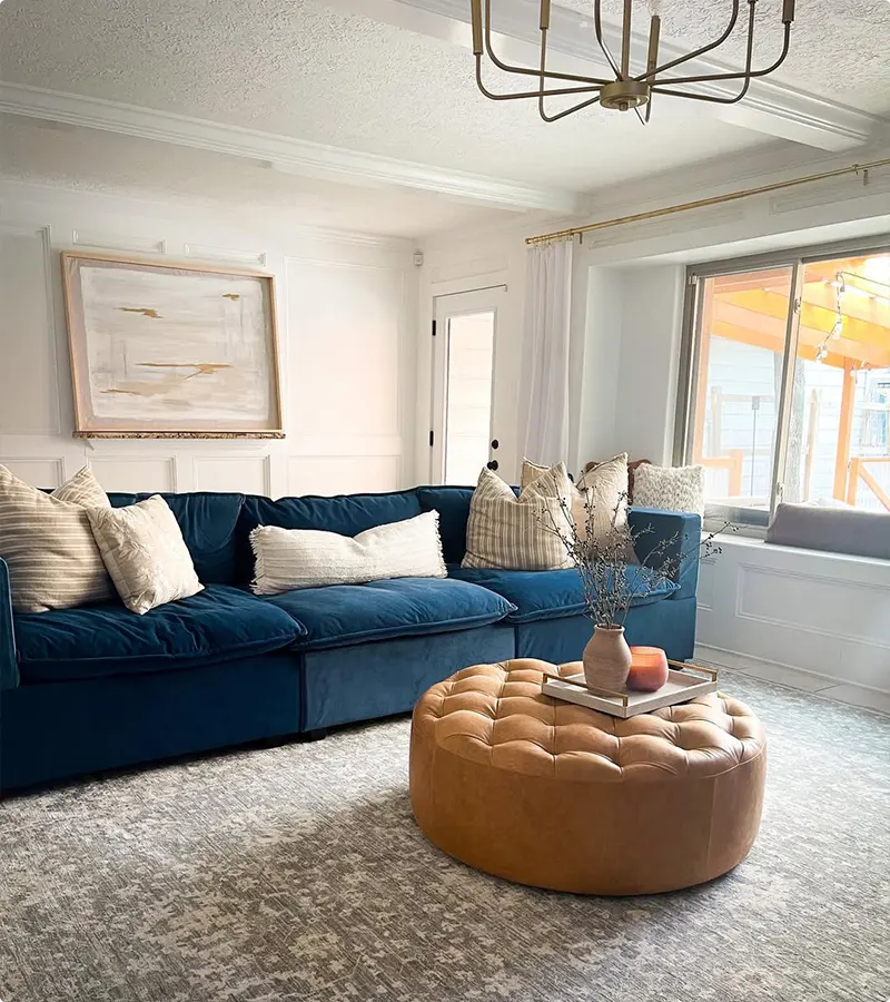 Oh, look at this beauty! That rich navy blue velvet couch is just begging for a cuddle session, and those white throws and fluffy pillows, seriously, it’s like a hug in fabric form!