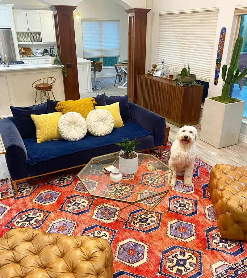 Look at this cutie with the navy blue couch, made even better by that fluffy dog stealing the spotlight, haha! Those yellow and white pillows add a pop of fun, and that red rug with its wild patterns? It’s like a party under your feet!