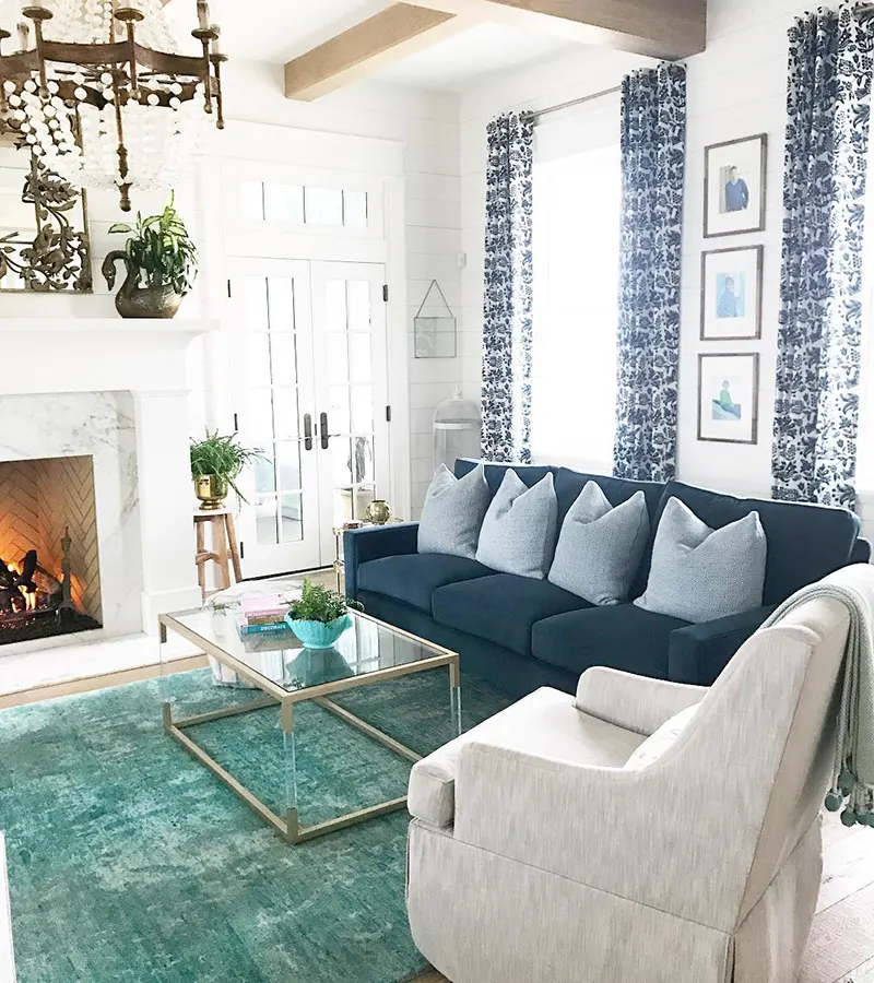 Navy Blue Couch by Fireplace with Teal Rug and Blue Curtains