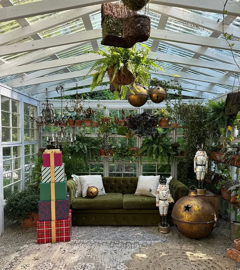 Your greenhouse or sunroom is technically an outdoor structure, so why not turn it into the ultimate Christmas lounge? I swear, this design works because it leans into the existing rustic-glam aesthetic, the abundant greenery and the glass roof, and just drops in some holiday drama.