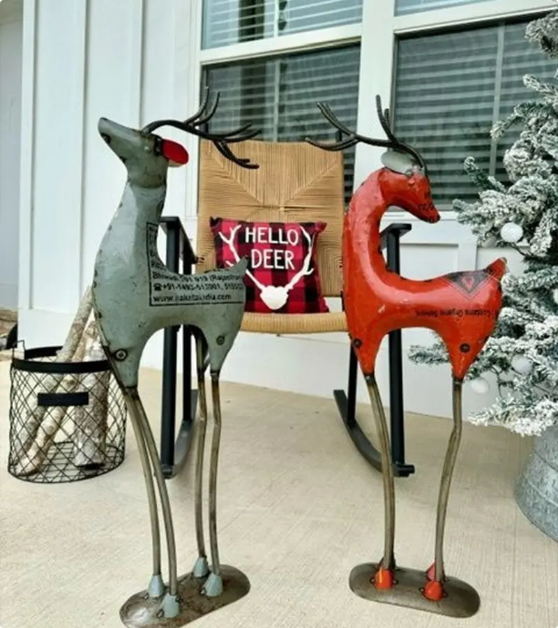 This is a perfect example of bringing a little bit of quirky, handmade style to your front porch. These aren’t your typical plastic reindeer; they look like they’re made from repurposed metal or industrial material, giving them that chic farmhouse vibe.