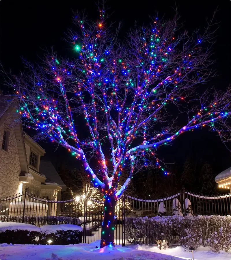 If you’ve got a big, beautiful deciduous tree in your front yard, don’t ignore it! I mean, you have to embrace the bare branches. This design is all about the intensive wrapping technique: literally covering every major limb and branch in multicolored lights.