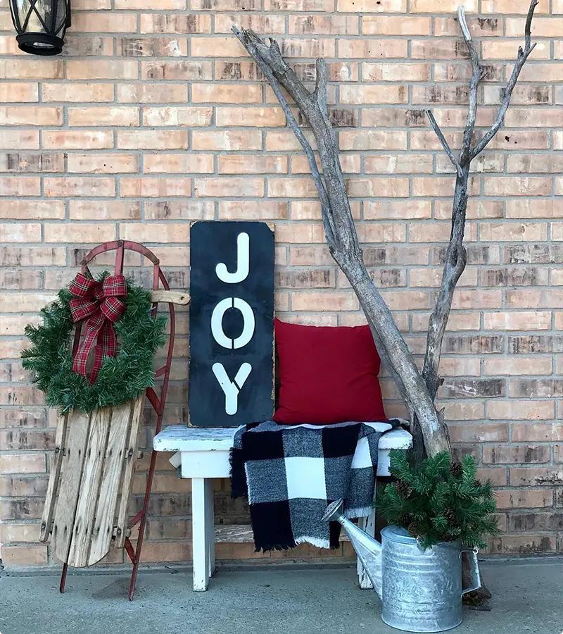 The warmth of the brick patio and the rustic touch of the birch twig chair create a perfect winter backdrop. Notice how they’ve softened the look with a simple plaid throw and a festive Christmas pillow? It’s all about making your existing furniture work for the holiday.