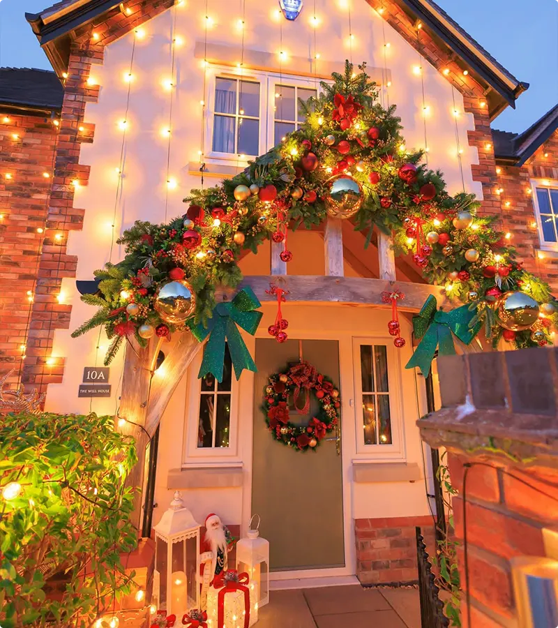 Then, you wrap the entire door frame in a thick, lush garland decorated with red accents. The warm white fairy lights draped over the porch roof and the two little brass-toned wall sconces amplify that inviting, golden glow.