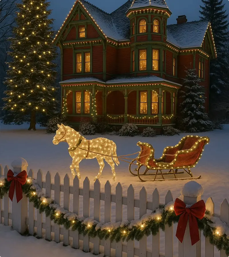 If you have the yard space, you absolutely must try a classic lighted animal display to anchor the whole scene. This one is pure elegance, a glowing horse pulling a beautiful, velvet-lined sleigh. Why does this work so well? It creates a strong focal point that is visible from a mile away, and it plays perfectly off the classic architecture of the house.