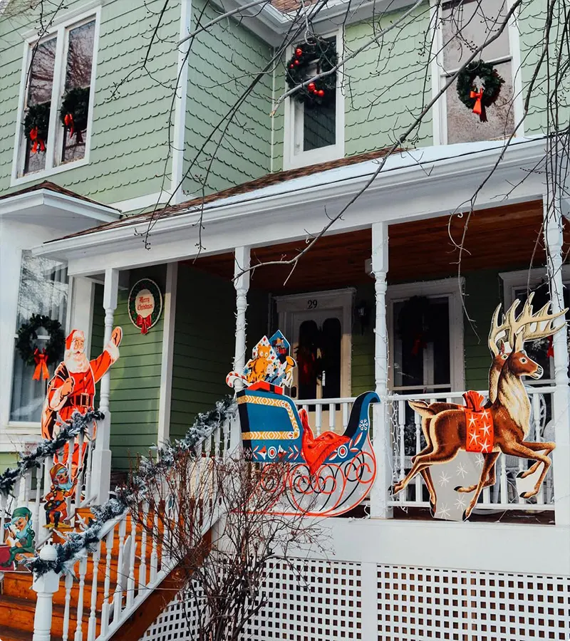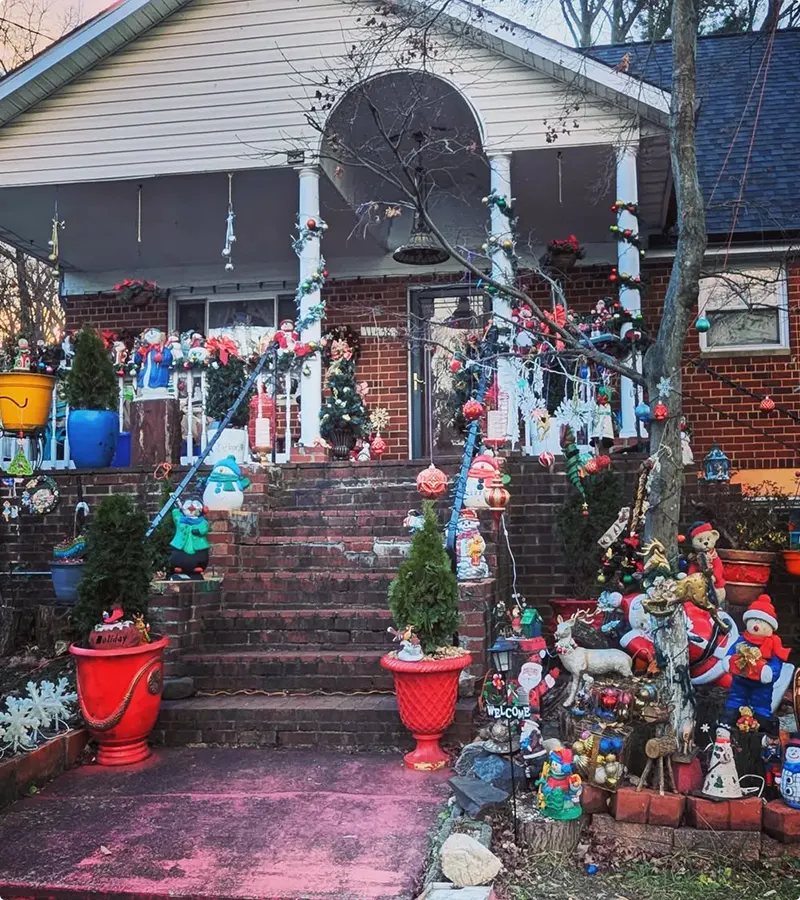 The trick here isn’t what they used, but how much they used: they lined every stair, every column, and every inch of the porch floor with collections of Santas, snowmen, and little trees.