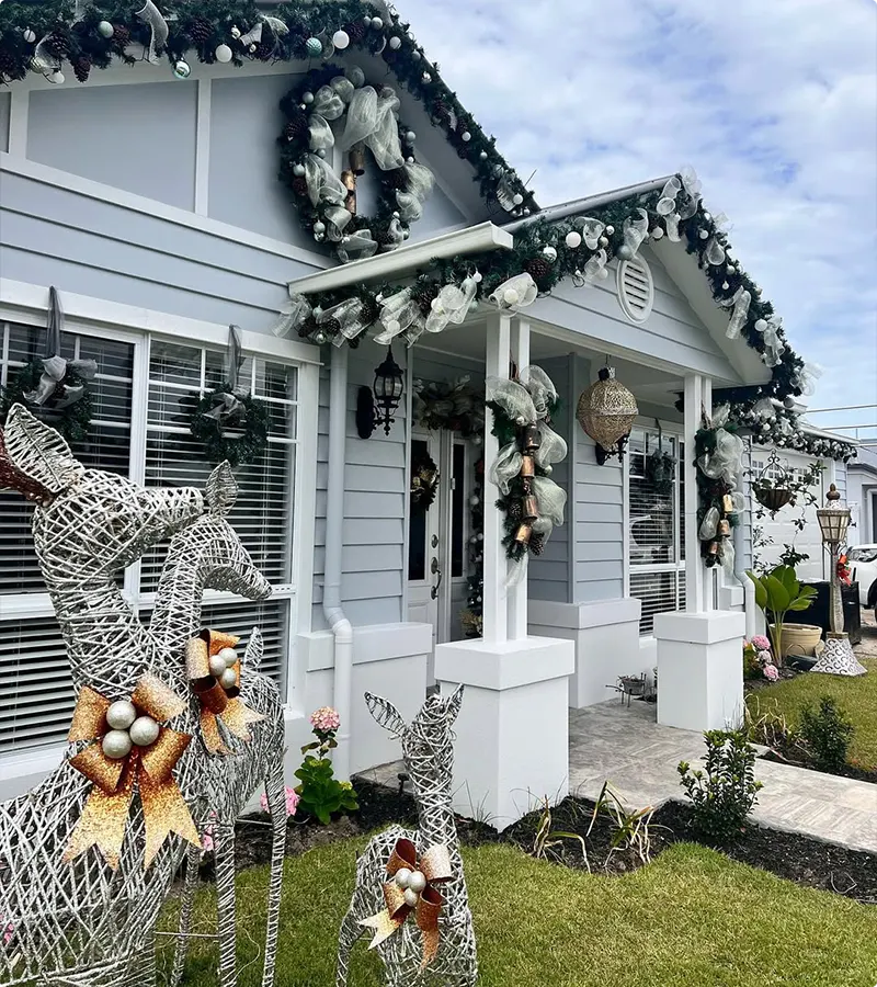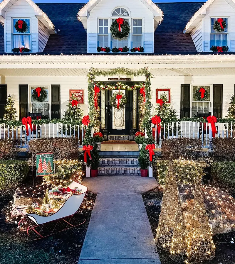This house nails that classic-but-cozy Christmas look. The porch is wrapped in full garland with oversized bows and ornaments, while the wicker reindeer on the lawn add a playful touch that still feels elegant.