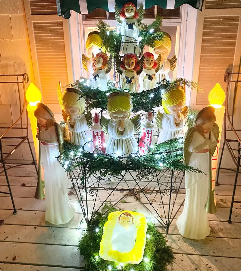 The design works because it creates a tiered centerpiece focused on the nativity (look at the Baby Jesus at the base!) and those beautiful, towering plastic angels and candles. The key here is the vertical arrangement, which lifts the figures up and makes them a focal point.