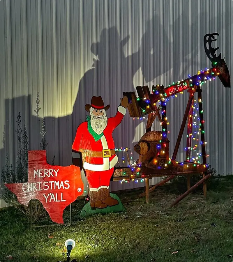 Oh, you have to appreciate the folks who personalize their holidays! This is pure, regional charm. Forget the traditional North Pole; this is the South Pole, or maybe the Southwest Pole, I mean! The whole design works because it takes two classic, local symbols, the oil pumpjack and the Texas state shape, and mashes them up with Santa.