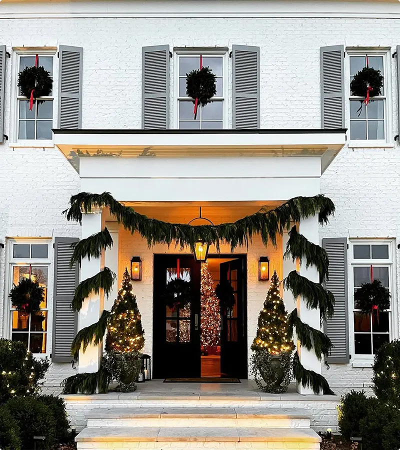 This design is all about maximizing coziness and symmetry. What works here is the complete framing of the front door, it makes the entry the undisputed focal point. You start with two perfectly matched lighted potted evergreens flanking the doorway (not gonna lie, black planters always look chic).