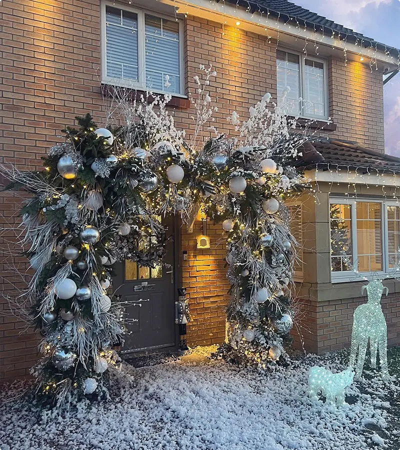 Now this one’s a showstopper. The oversized garland arch packed with frosted greenery, giant ornaments, and twinkling lights makes the whole entrance feel like you’re walking into a winter wonderland.