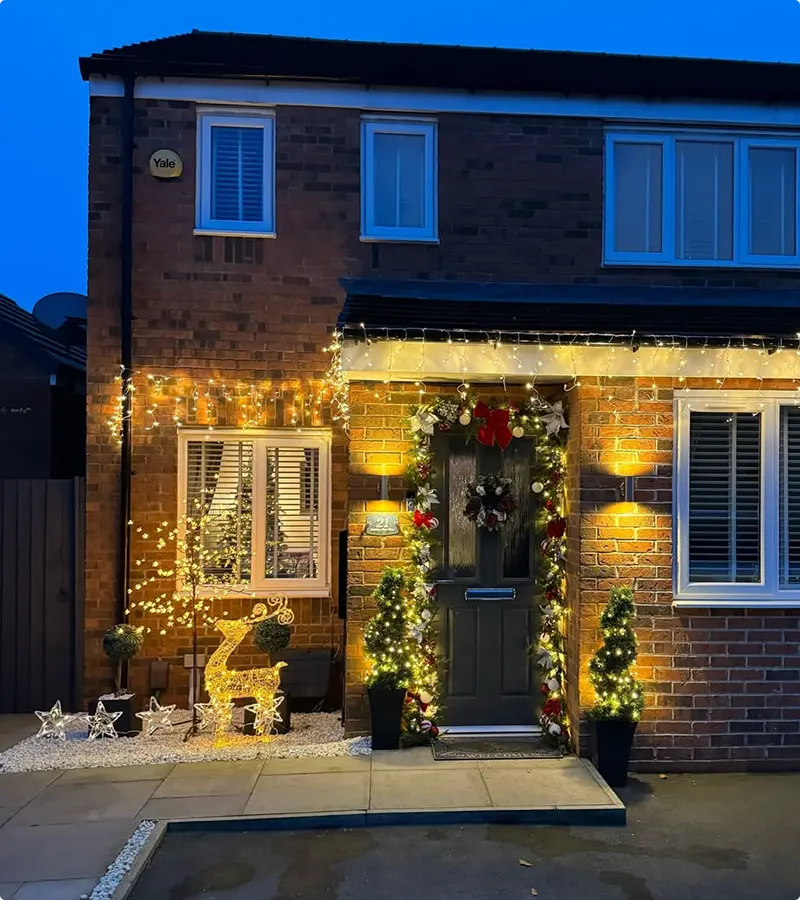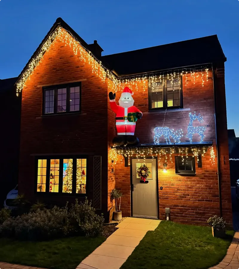 They’ve balanced the height with those delicate icicle lights draped across the roofline and the glowing reindeer motif on the main wall. Tip: If you have an overhang or ledge, look for decorations that can be weighted or tied down safely up high, it completely elevates your whole display, literally!