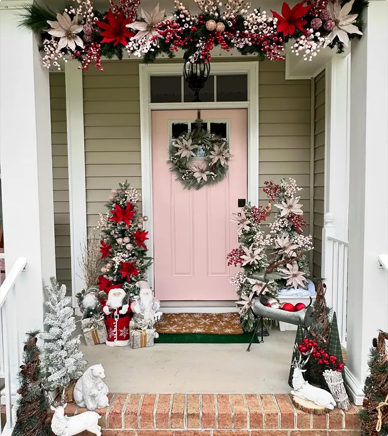 This is proof that Outdoor Christmas Decorations don’t always have to be red and green! The genius of this look is the total commitment to a beautiful, frosted color palette that complements the pink door. Look at that gorgeous, cascading pomegranate garland above the doorway, it’s loaded with red poinsettias, silver flowers, and frosted berries.