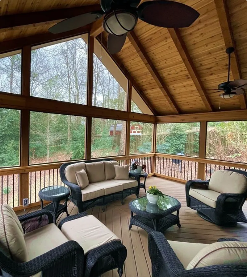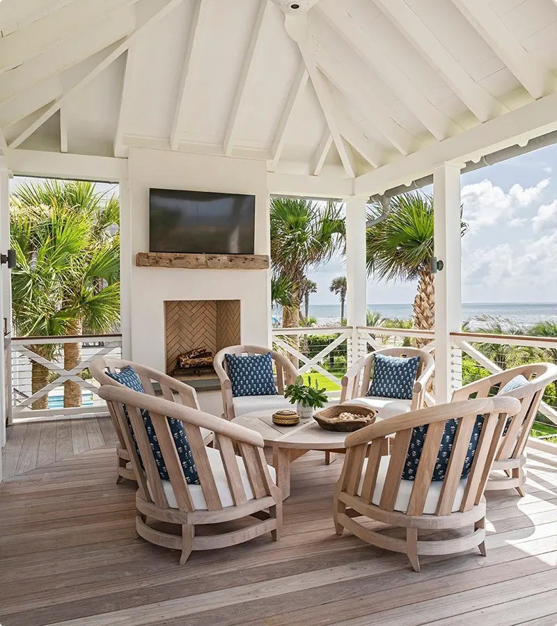 It usually has comfy seating, soft cushions, and warm lighting that make it feel like a real living room, but with fresh air and sunshine. You can add plants, rugs, and small tables to make it complete.
