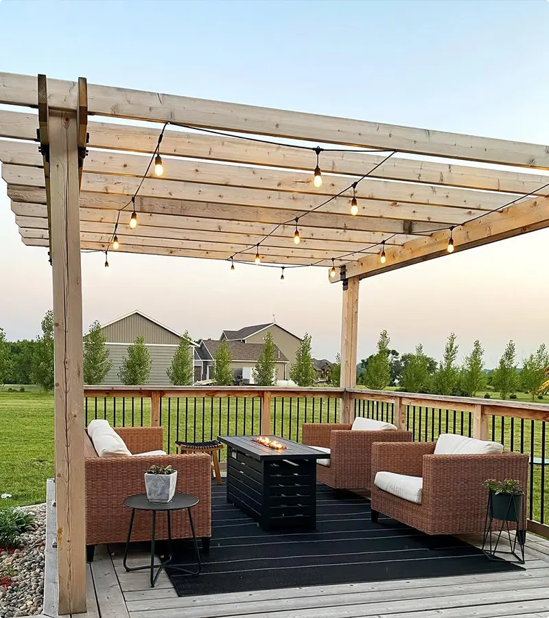 I mean, how perfect is this for watching the sun go down? Seriously, it’s such a welcoming little space. They’ve defined the area with a simple wooden pergola, nothing too heavy, just enough structure to hang those gorgeous string lights.
