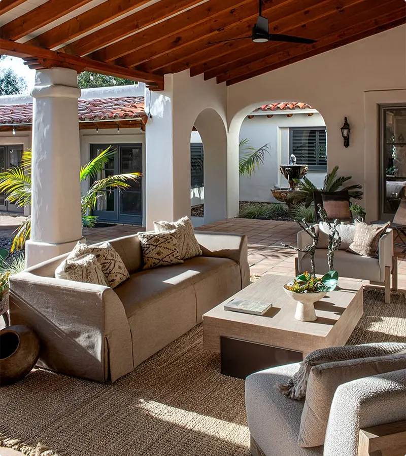 It works like a charm because the thick columns and arched walkways provide permanent, cool shade, creating a genuine outdoor room feel. Seriously, look how those big patterned throw pillows tie the whole warm, earthy color palette together, that’s a pro tip right there.