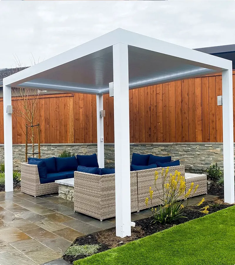 Look at the contrast here! That clean, white modern pergola is instantly striking, isn’t it? Pairing it with the vibrant, almost nautical navy cushions gives this little seating area such a crisp, defined look.