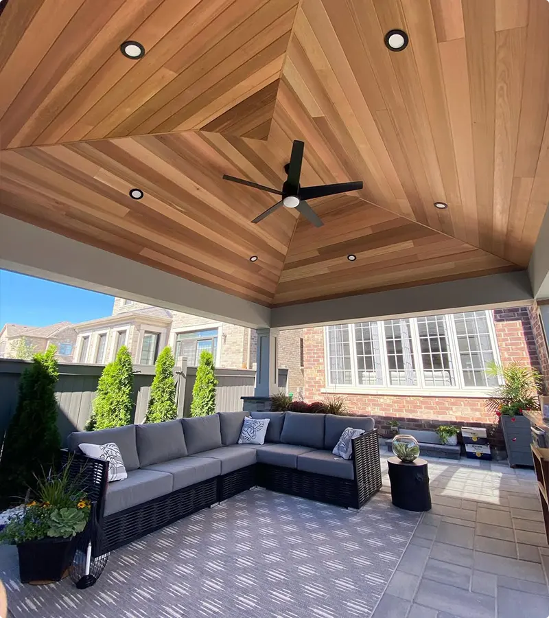 That wood-paneled ceiling is just gorgeous, it immediately draws your eye upward and makes this covered patio feel so custom, right? The geometric pattern in the ceiling is just fantastic; it makes the space feel architecturally special.