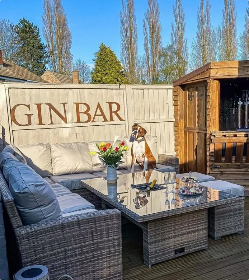 This whole setup works because the fun, weathered fence and the rustic wood bar shed give it so much personality, keeping it casual and inviting.