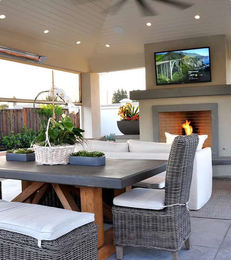 This covered patio setup is pure genius because it literally has everything, a fireplace, a TV, and a dining spot. The crisp white cushions and light neutral walls give it that luxurious, indoor feel, which is totally what you want for an extension of your house.