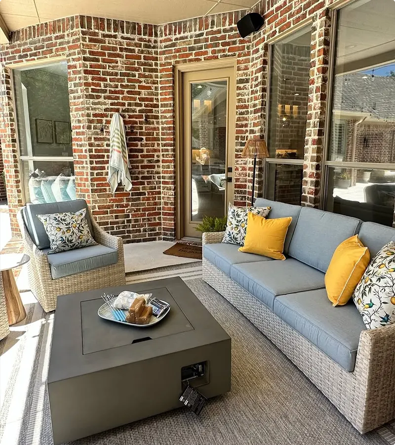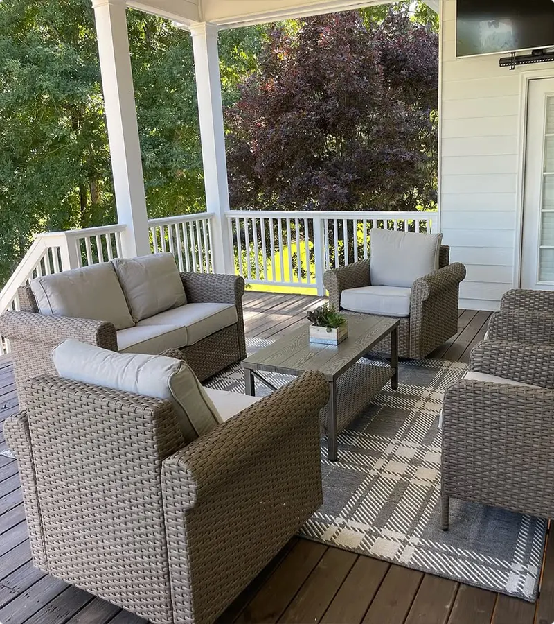 Decorating your outdoor living room is all about making it feel warm, welcoming, and personal. Start with comfortable furniture, like outdoor sofas, chairs, or a swing. Choose weather-friendly materials that can handle sun and rain. Add soft pillows, cozy blankets, and an outdoor rug to make the space feel homelike.