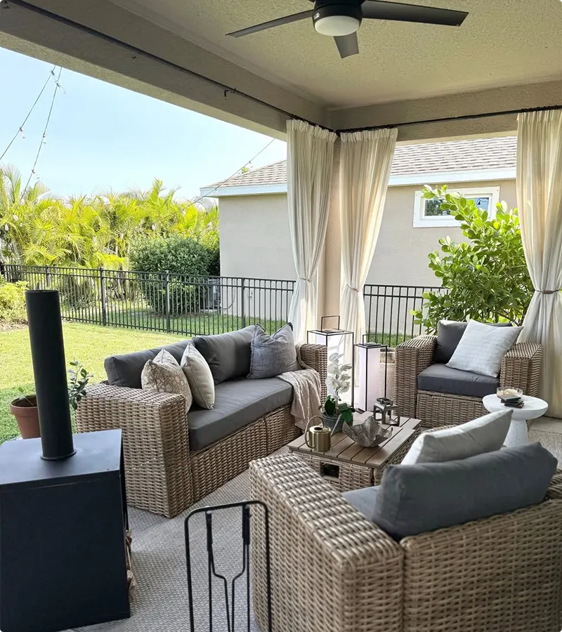This design works because those curtains and the area rug really define the room, giving it walls and a floor even though you’re outside, it’s just a smart way to make a patio feel like a finished room.
