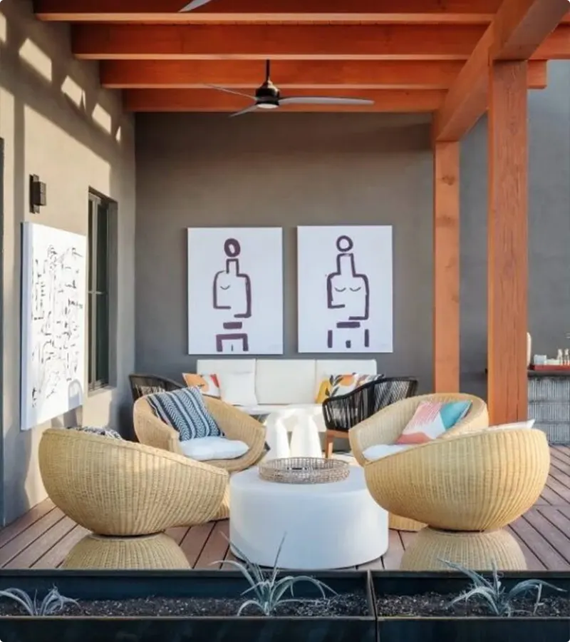 I’m obsessed with those two big, basket-like woven chairs; they feel very sculptural and comfy all at once. The contrast between the warm, chunky wood pergola beams and the dark gray backdrop is really what makes this space pop, don’t you think?