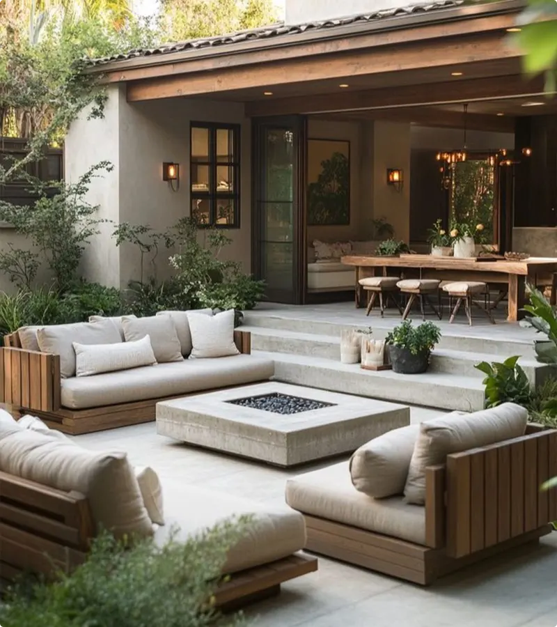I love how the warm cedar sofa frames contrast with the light, creamy concrete of the fire pit and the floor.