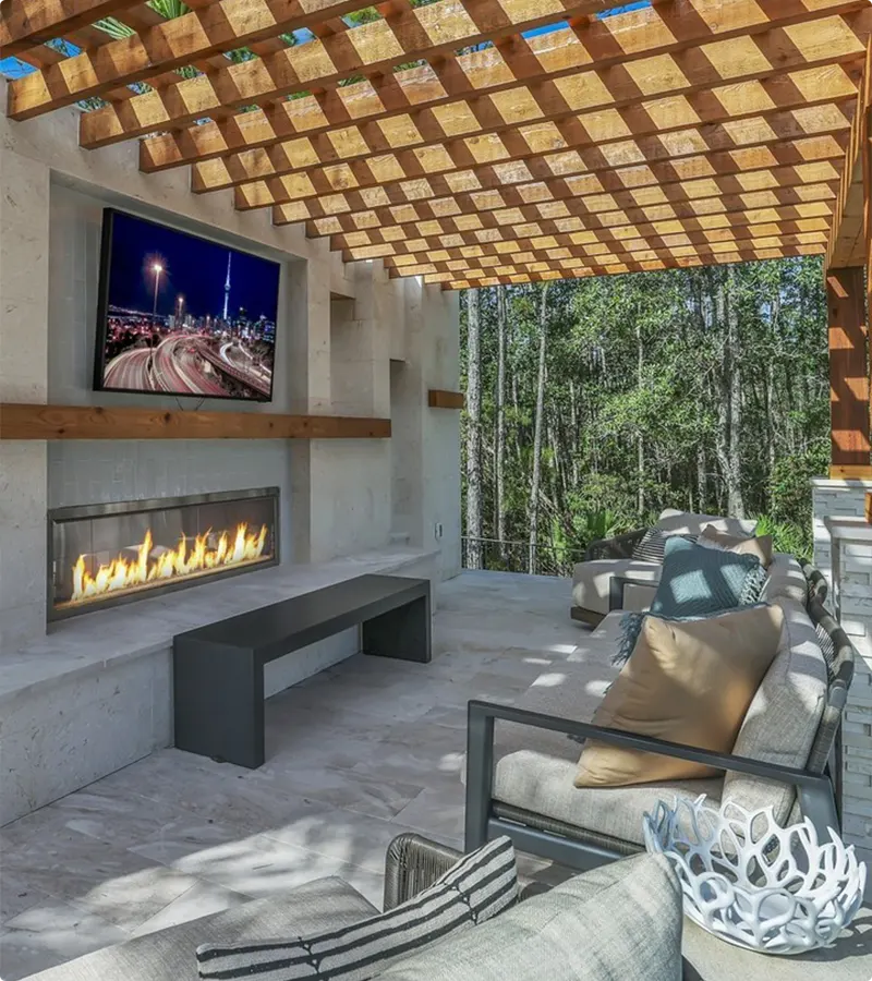 The combination of the warm, slatted wood pergola overhead and the cool stone flooring keeps the whole thing feeling grounded and breezy at the same time.