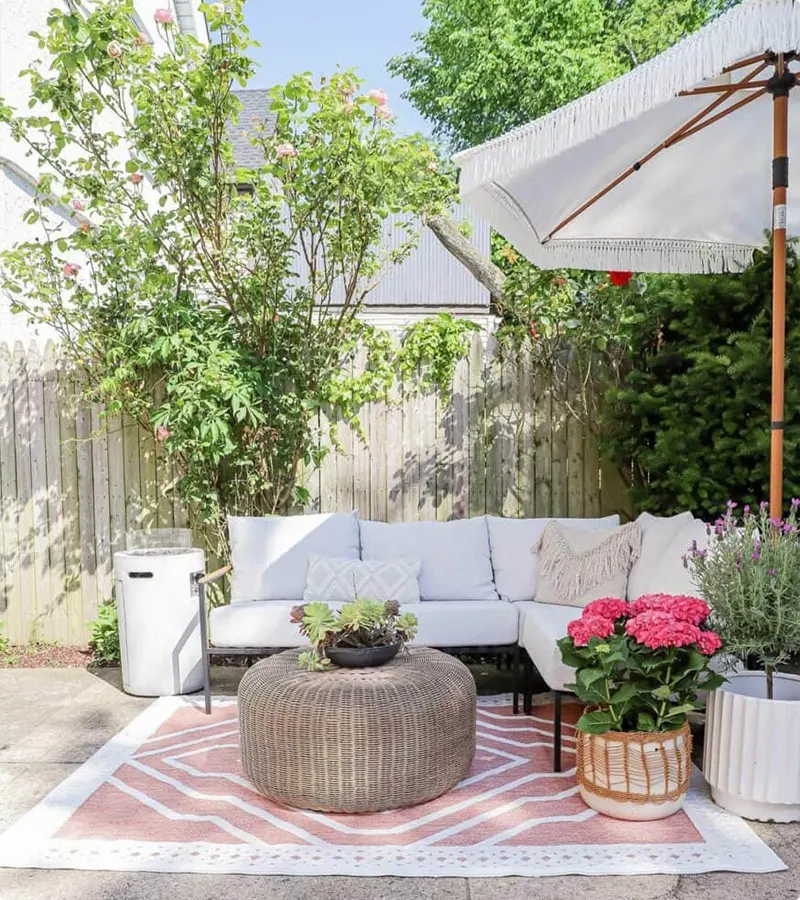 The modern white sectional paired with that big, round woven ottoman keeps everything feeling super cozy and low-key. This is such great proof you don’t need a massive yard to carve out a complete, stylish living area, especially with the charm of that fringed umbrella.