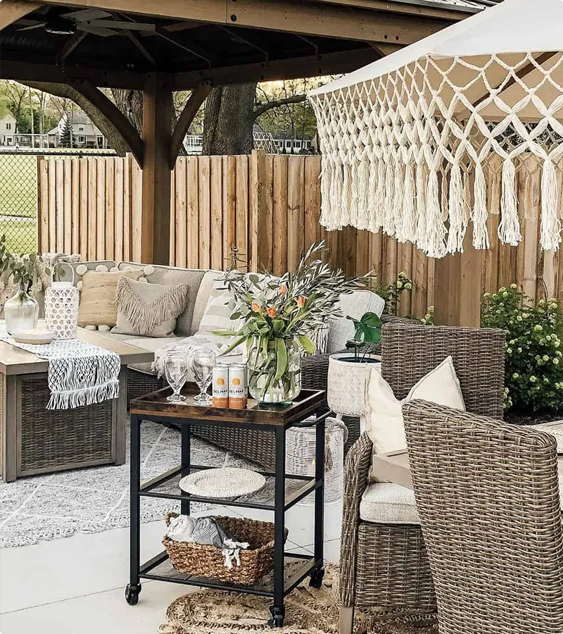 Add soft pillows, blankets, rugs, and warm lights. You can also use plants, candles, or a small fire pit to make it extra comfy.