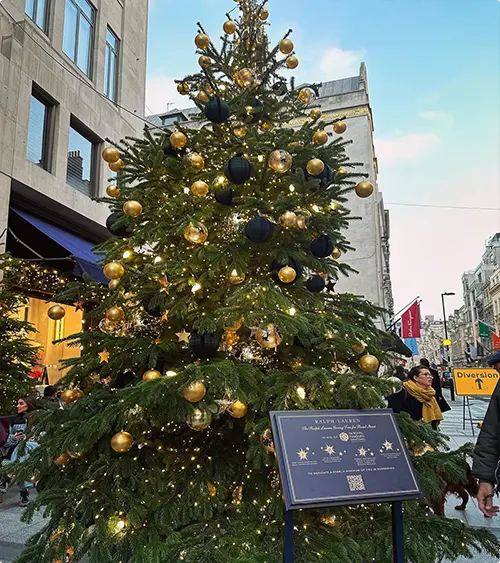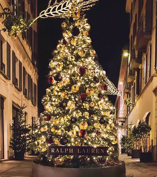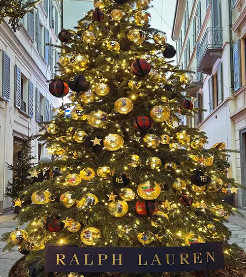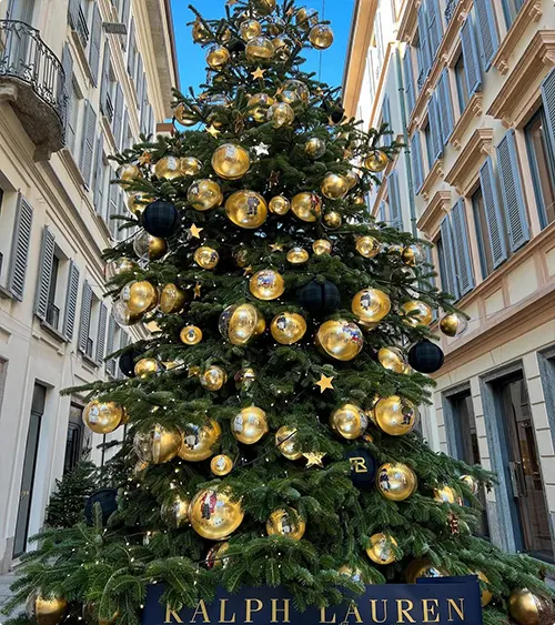 This tree on a European street during the day shows off gold and black ornaments. The Ralph Lauren logo glows at the base.